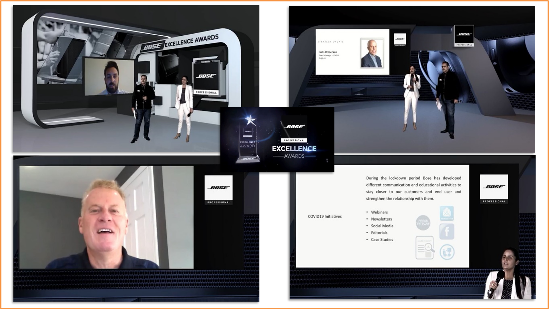 The Hosts would be live in the Virtual 3D Studio, whilst the Presenters and Awards winners would be beamed in Via MS Teams, and a select Audience would view the program via the Bose Corporate MS Teams meeting platform